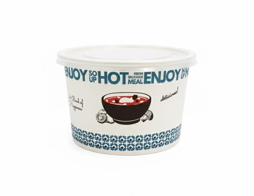 Bol supa din carton imprimat 500ml cu capac transparent.Rezistent la lichide, la temperaturi ridicate cu capac de plastic cu prindere buna.Design prezentabil.La cerere se poate comanda si fara capacEste un ambalaj potrivit pentru livrari, catering, fast food, to go, festivaluri.Volum 500mlDistribuit de Clickpack