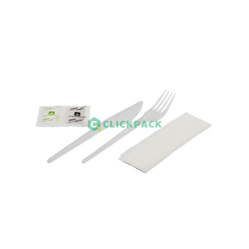 Set ambalat individual de furculita+cutit reutilizabile si servetel si pliculete de sare si piper. Metoda eleganta si igienica de a servi tacamuri in locatiile si la evenimentele dumneavoastra.                    Distribuit de Clickpack...